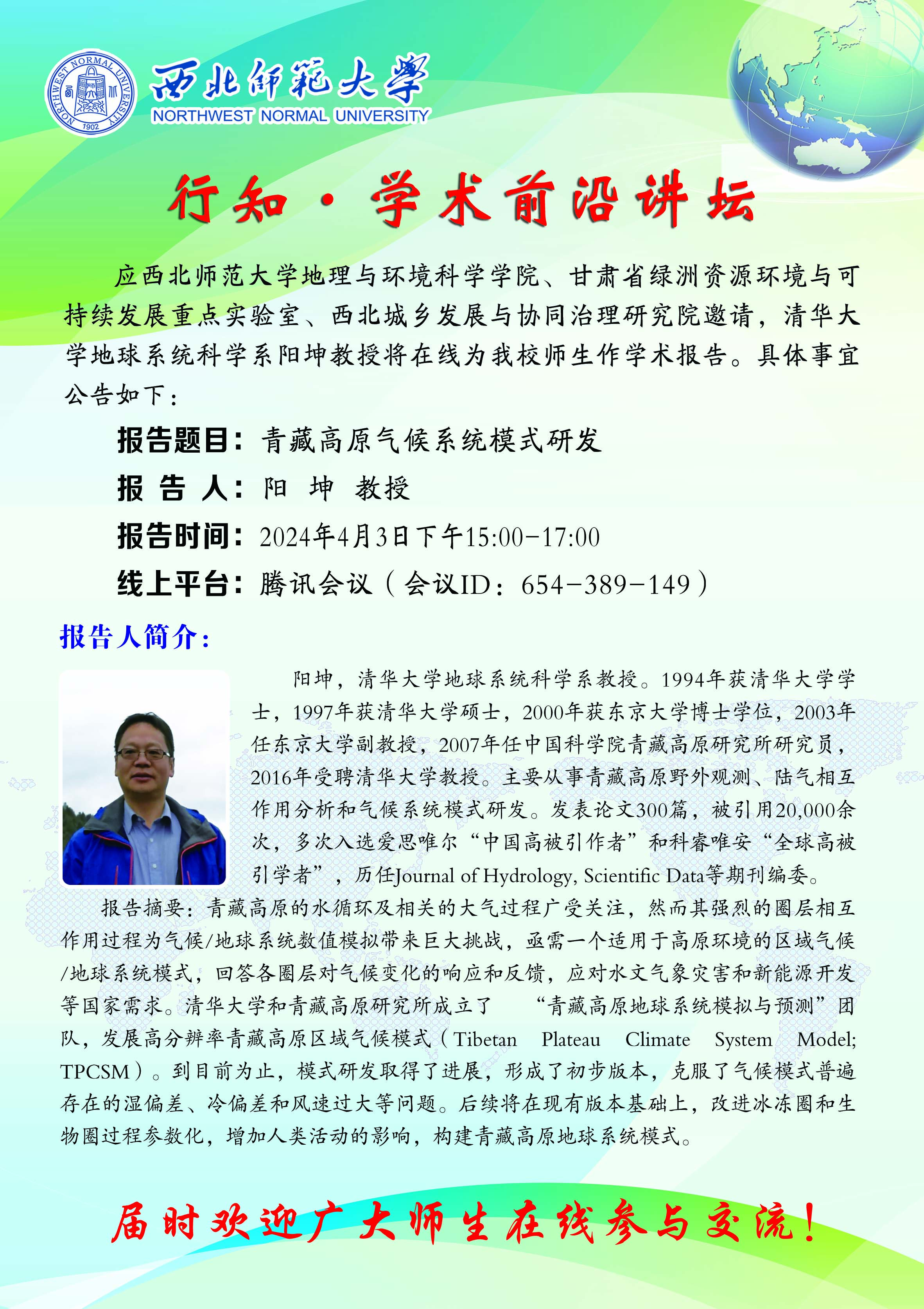 地环学院行知•学术前沿讲坛 2024-04期:青藏高原气候系统模式研发