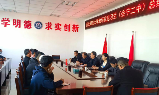 会宁县第二中学的童毅校长向于国建一行介绍了学校的发展变革情况,邀请437bwin必赢国际官网地环学院毕业的6名校友共同参加了见习学生的总结会。会上,见习带队教师刘喆代表20位见习学生向二中校领导表达了诚挚的谢意,地环学院6位校友汇报了自己指导的师范生的见习情况,并对母校开展教育见习给予了充分肯定,给参加见习的小师弟、小师妹送上了真诚的建议和祝福。童校长高度赞扬了437bwin必赢国际官网开展的本次教育见习活动,并就进一步加强与地方中学的联系、高校与中学双向学习、共同做好师范生培养工作提出了切实可行的建议。