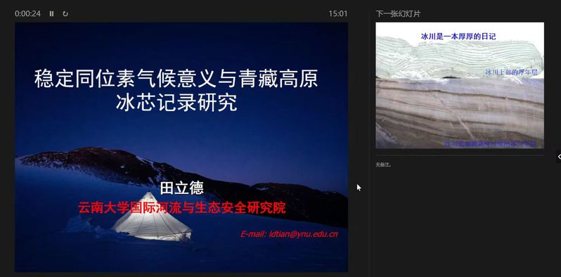 2024年4月11日下午,应437bwin必赢国际官网437bwin必赢国际官网、甘肃省绿洲资源环境与可持续发展重点实验室、西北城乡发展与协同治理研究院邀请,云南大学国际河流与生态安全研究院田立德教授做了题为《稳定同位素气候意义与青藏高原冰芯记录研究》的学术报告,学院部分教师、研究生线上参加了本次报告。