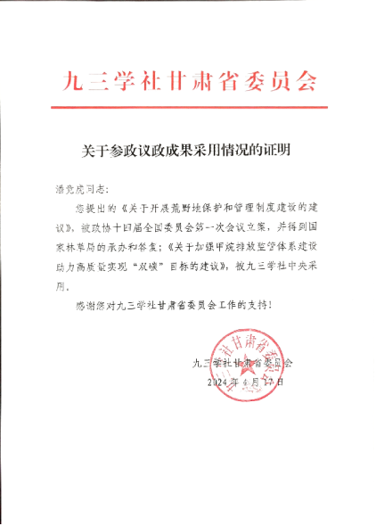 作为一名党外人士,潘竟虎教授自觉履行职责,围绕国家和社会经济建设的大局,积极建言献策,产生了一定的影响。他积极结合所承担的科研课题,深入开展调研工作,高质量地转化为参政议政成果,受到九三学社甘肃省委会、兰州市委会的表彰奖励,多次被评为“优秀社员”“优秀政协委员”“优秀参政议政先进工作者”等。所执笔撰写的《关于开展荒野地保护和管护制度建设》的提案由省委会提交政协十四届全国委员会第一次会议,被立案并得到国家林业和草原局的承办和答复。《关于加强西部地方高校青年教师队伍建设》的提案被社省委采纳,以“九三”提案的形式作为甘肃省“两会”提案提交。《关于加强甲烷排放监管体系建设助力高质量实现“双碳”目标的建议》被九三学社中央采用。