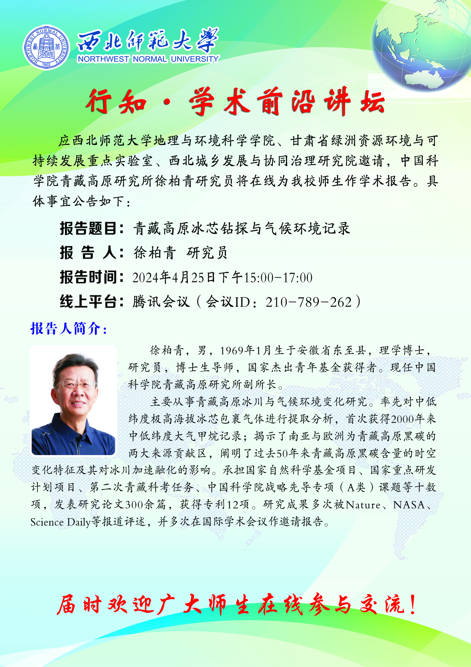 地环学院行知•学术前沿讲坛2024-08期:青藏高原冰芯钻探与气候环境记录