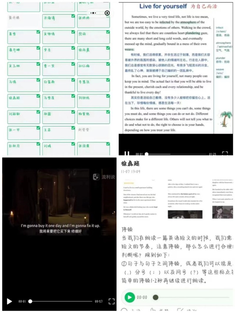 口语提升板块中,学生每日自主选取一段英语美文进行朗读,在打卡群提交一分钟左右的音频或视频进行每日打卡,以此增强朗读能力,提高口语水平。此外,还有英语电影配音等内容,增加了打卡活动的趣味性,提高了该活动的每日打卡率。
