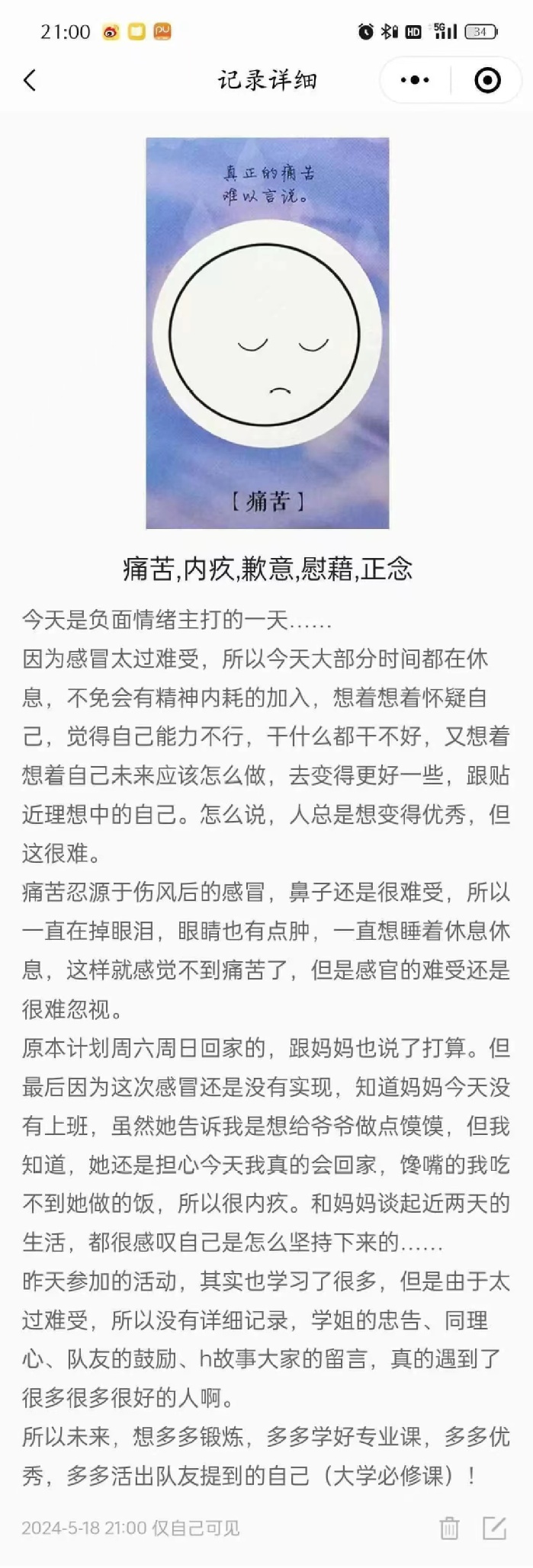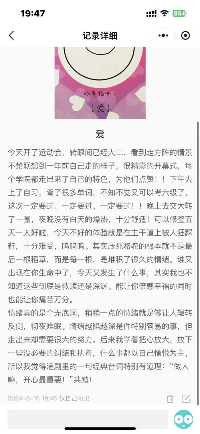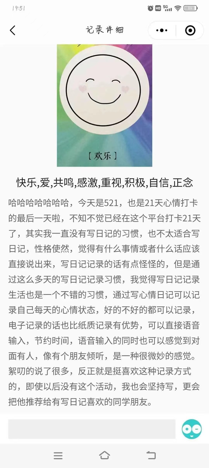 随着最后一页的翻过,我们共同走过的这21天情绪记录打卡活动,如同一段美妙的旋律,在时间的长河中缓缓流淌。每一次的打卡,都是对内心的一次深度挖掘。每一次的分享,都是对彼此的一次心灵触碰。让我们用更加敏锐的感知去捕捉生活中的每一份情感,用更加宽容的心态去接纳自己的内心。愿我们都能成为更好的自己,在人生的旅途中绽放出更加绚烂的光芒。