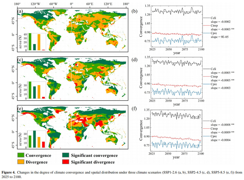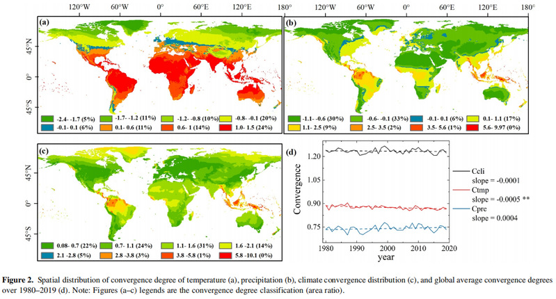 该研究建立了一个以每年的气温和降水平均值为原点,以温度和降水为X轴和Y轴的坐标系统,各栅格的温度和降水与原点的差值称为温度和降水趋同度(即与全球均值的差异)。研究结果表明,1980-2019年期间,各地温度分布向全球均值靠近(趋同化),降水分布远离全球均值(多样化),两者共同导致了全球气候分布的趋同化,全球气候变得越来越一样了。该研究还分析了2025-2100年未来情景下的气候格局变化,低排放模式(SSP126)有效地保持了全球气候分布的多样性,而在高排放模式(SSP245和SSP585)下,全球气候分布显著趋同化。温度是气候趋同化的主要驱动力,降水在气候多样化中起到核心作用。