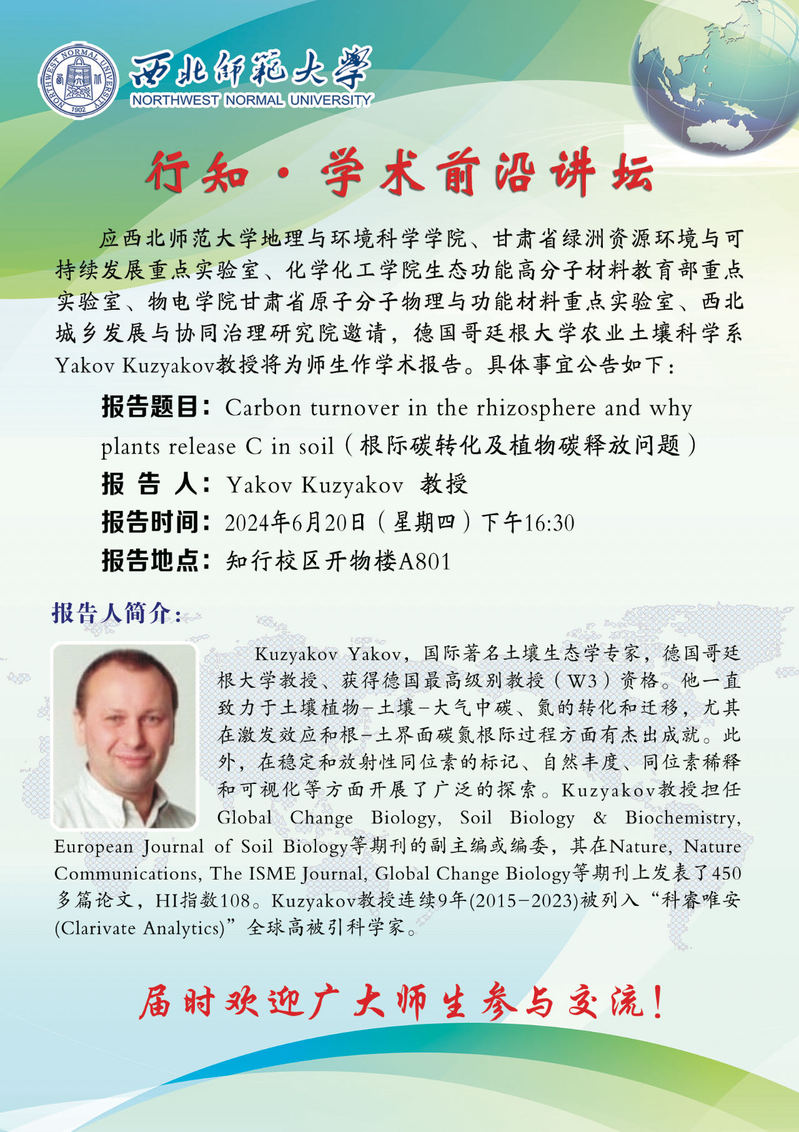 地环学院行知•学术前沿讲坛2024-11期:Carbon turnover in the rhizosphere and why plants release C in soil(根际碳转化及植物碳释放问题)