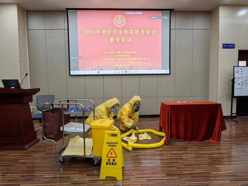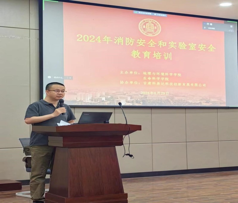 会议邀请北京卫民安消防教育咨询中心甘肃分中心张雨成教官和兰州大学兰景风高级工程师分别就消防安全和实验室安全进行了专题讲座,甘肃科易达科技创新发展有限公司的技术人员现场组织了实验室安全事故应急演练和知识竞赛。甘肃省化学会办公室主任王天新、学院党委书记于国建、生命科学学院实验中心副主任贾凌云、学院实验中心主任王继伟、实验中心全体教师以及地环学院和生科院师生共计150余人参加了培训。会议由副院长潘竟虎主持。