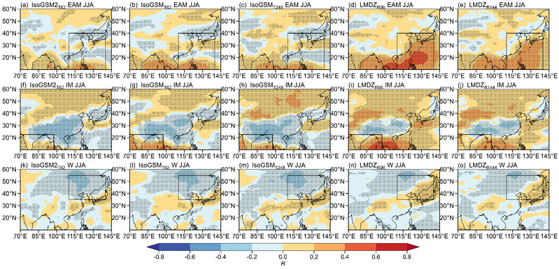 图2 夏季日尺度水汽同位素和东南季风、西南季风和西风关键区风速之间相关系数的空间分布