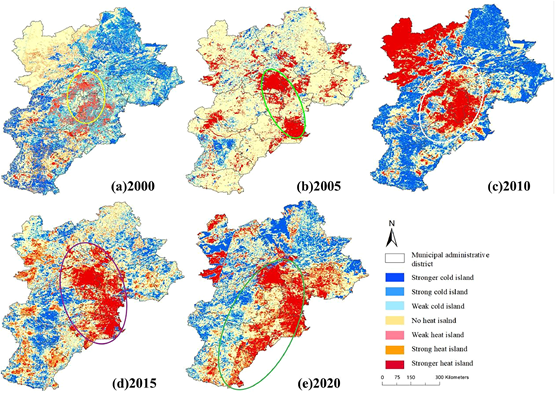 图2 夏季城市热岛的空间变化(2000年、2005年、2010年、2015年、2020年)