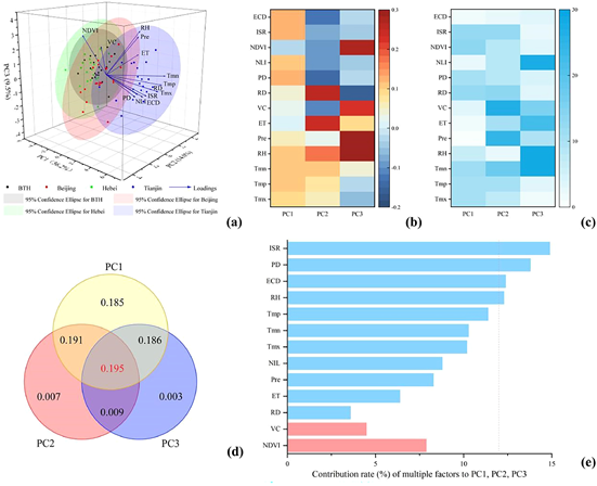 图3 基于主成分分析和多元线性回归检测相互作用的分析。(a) URI 的第 1、2和 3 个主成分(分别为PC1、PC2 和PC3)的三维图;(b)影响因素对PC的荷载;(c)影响因素对PC的贡献率;(d)多元回归结果;(e)多个因素的交互贡献率,红色条表示负贡献。