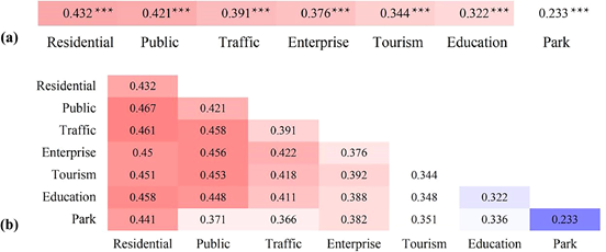 研究将该策略抽象为POI核密度。结果表明,政策对京津冀地区的热岛有显著影响(图4)。研究发现,住宅(0.432)、公共设施(0.421)和企业(0.391)是UHI的主要来源,约占热影响的40%或更多。在相互作用中测试了五种类型的相互作用(双重增强、非线性增强、独立、单弱和非线性弱化),所有结果都显示出双重增强。这表明,协同政策对城市群来说是整体和一致的。影响最大的六大因素是住宅和公共设施(0.467)、住宅和交通(0.461)、住宅和教育(0.458)、公共和交通(0.458)、公共和企业(0.456)以及公共设施和旅游(0.453)。公园和公共与交通分别低于其单一影响,分别为0.050和0.025,这意味着两者之间的相互作用具有缓解作用。