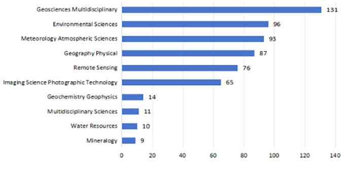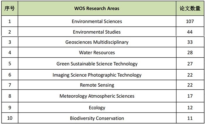 2014-2023年全校地球科学发表的308篇论文覆盖WoS学科分类下的22个研究领域,其中地球多学科、环境科学、气象学大气科学领域发文最多(图6)。
