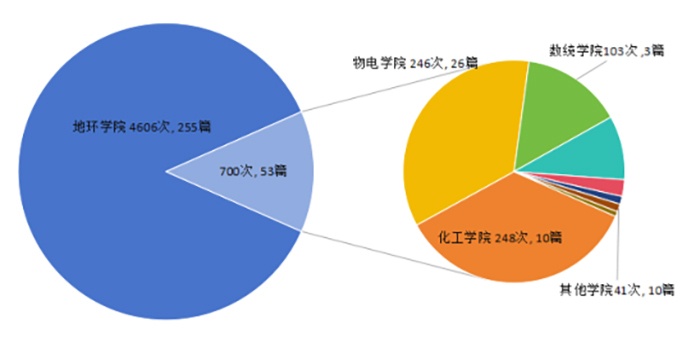 2014-2023年地球科学论文作者分别来自我院、化学化工学院、物理与电子工程学院等9个学院。其中,我院发文255篇,被引4606次,分别占地球科学发文总量和总被引频次的82.79%、86.12%(图5)。