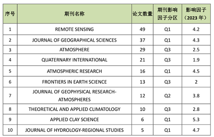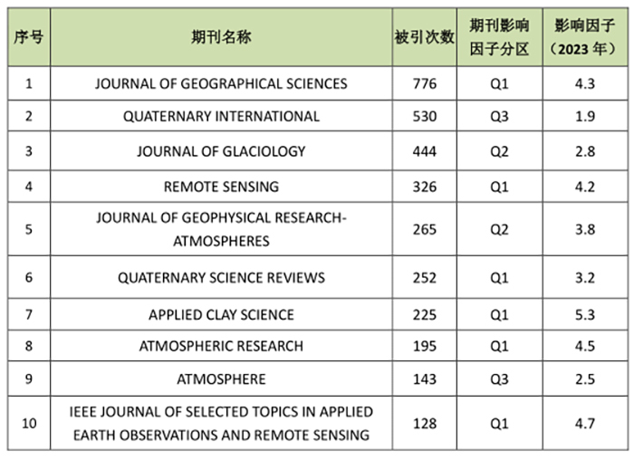 2014-2023年我校地球科学论文覆盖73种ESI期刊,发文数量最多的期刊是《REMOTE SENSING》,共计49篇(表7);被引次数最多的期刊是《JOURNAL OF GEOGRAPHICAL SCIENCES》,总被引776次(表8)。