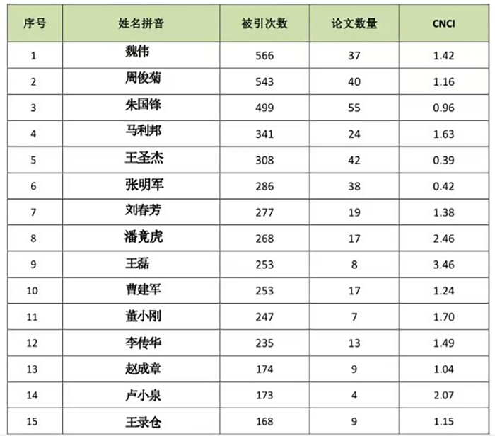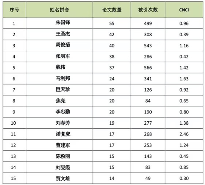 2014-2023年,环境学/生态学全校发文量TOP15榜单中我院教师占14位,占93.33%,发文最多的作者是我院朱国锋,论文共计55篇(表4);环境学/生态学全校被引次数TOP15榜单中我院教师占12位,占80%,发文被引次数最多的是我院魏伟,总被引566次(表5)。