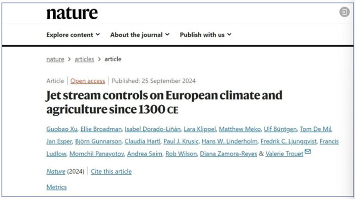 2024925日,国际顶尖期刊Nature(《自然》)发表了题为《Jet stream controls on European climate and agriculture since 1300 CE(大气急流影响了欧洲七个世纪的极端事件)》的研究论文。文章揭示了大气急流的位置变化,对欧洲森林生态系统和社会、经济的影响进行了探讨,揭示了西北欧和东南欧之间对比鲜明的气候条件对农业、经济和社会的影响。徐国保教授为该文章第一作者,是我院地理科学专业2008届本科毕业生。