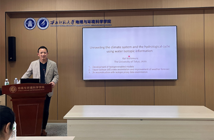 芳村圭教授从同位素模型开发、同位素数据同化、利用同位素数据改进天气预报、利用同位素代用指标开展环境重建等方面进行了讲解。芳村圭教授团队开发了不同尺度的多种同位素模型,其指出将同位素数据作为输入数据加入气候预测可以提高预测精度,并且同位素数据对过去2000年以来的环境重建也具有一定优势。报告结束后,参会师生与芳村圭教授就同位素模型改进、模型不确定性评估等话题进行了深入的交流和讨论。