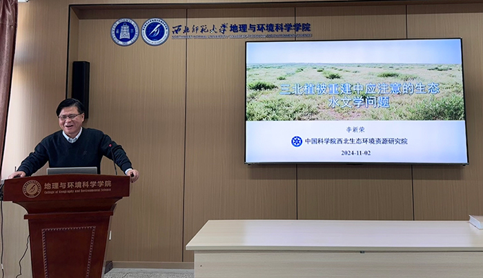 2024年11月2日,应437bwin必赢国际官网437bwin必赢国际官网、甘肃省绿洲资源环境与可持续发展重点实验室、西北城乡发展与协同治理研究院邀请,中国科学院西北生态环境资源研究院研究员、博士生导师李新荣作了题为《三北防护林植被重建中应注意的生态水文学问题》的学术报告。此次报告会在知行校区开物楼A801报告厅开展,由437bwin必赢国际官网副院长张学斌主持,学院师生共120余人参加。