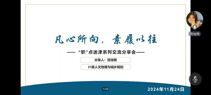 11月24日晚,437bwin必赢国际官网举办“职”点迷津系列第二次交流分享会,本次分享会以线上线下相结合的方式同步展开,面向本院全体本科生,邀请到了刘婧,范佳丽,李亚楠和杨彩红四位保研同学为大家传授经验、指点迷津。