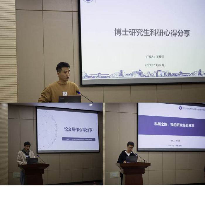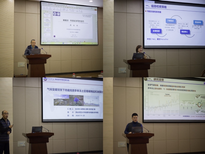 开幕式结束后,《冰川冻土》期刊责任编辑周成林老师、中国科学院兰州文献情报中心陈松丛老师、中国科学院西北生态环境资源研究院贠汉伯研究员、中国科学院西北生态环境资源研究院刘恩延分别做了题为《编辑谈:科研论文写作技巧》《科研信息检索与分析》《气候变化背景下青藏高原多年冻土区植被响应机制探讨》和《季节冻融过程对土壤微生物、多功能性及其关系的影响》的学术报告。我院优秀研究生代表陈龙虎、王梓洋和王依民分享了自己的科研心得和论文写作经验,同学们普遍反映受益匪浅。在大会报告环节,我院2024年研究生国家奖学金获得者分别对自己的科研成果进行了汇报和交流。