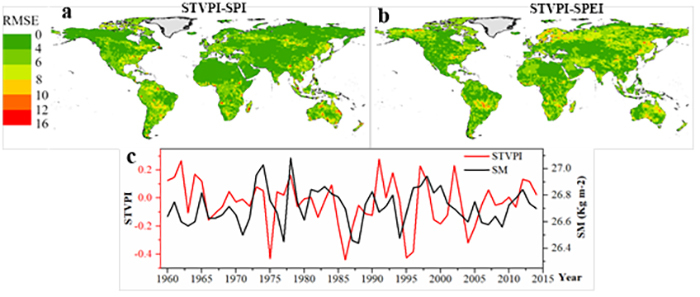 Fig. 3. Accuracy validation of STVPI and TWS. a and b are RSME of STVPI with SPI and SPEI at spatial scales, respectively. c is a linear trend fit of STVPI and SM from January 1960 to December 2014.