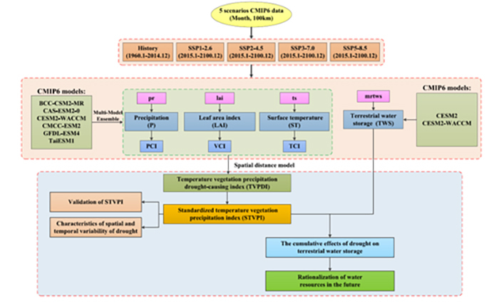 近日,437bwin必赢国际官网魏伟教授研究团队联合中科院西北生态环境资源研究院、澳大利亚科廷大学、阿联酋阿拉伯联合酋长国大学等多家科研单位,以CMIP6的5个不同情景(History、SSP1-2.6、SSP2-4.5、SSP3-7.0和SSP5-8.5)的地表温度(LST)、叶面积指数(LAI)和降水(P)数据,利用空间距离模型,概率分布函数和累积分布函数,构建了全新的标准化温度植被降水指数(STVPI),在多角度验证该指数科学、有效性的基础上,利用该指数监测了全球干旱状况,该指数也被用于监测全球干旱状况和调查陆地储水量(TWS)的抗旱稳定性。在干旱条件下,陆地水储量的稳定性显得十分重要,对其稳定性进行评价,进而探究全球陆地水储量对干旱的响应,用以识别未来全球陆地水储量的脆弱区具有重要价值。