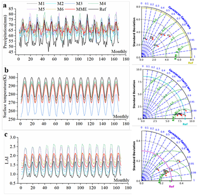 Fig. 5. CMIP6 models sensitivity in historical periods (2001.1-2014.12).From M1 to M6 are BCC-CSM2-MR, CAS-ESM2-0, CESM2-WACCM, CMCC-ESM2, GFDL-ESM4 and TaiESM1 respectively.In the Taylor diagram, the closer the distance between the model and Ref, the better the performance of the model. Ref is the reference value of precipitation, surface temperature and leaf area index.MME is the result of CMIP6 multi-model integration.