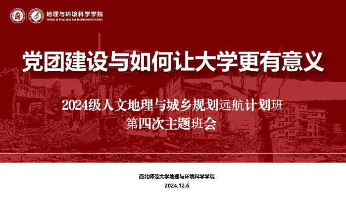 为引导新时代大学生坚定信念、立报国强国大志向、做挺膺担当奋斗者,根据学校《关于进一步加强班主任队伍建设“远航计划”工作的通知》,2024年12月6日下午,2024级人文地理与城乡规划“远航计划”班召开第四次主题班会,学院副书记、副院长、导航班主任谢文涛,护航班主任王祥及全体同学参加此次班会。