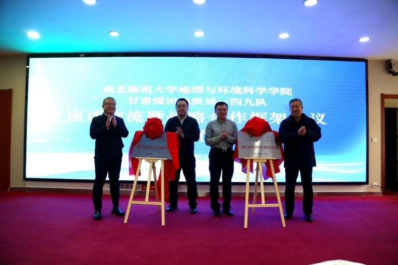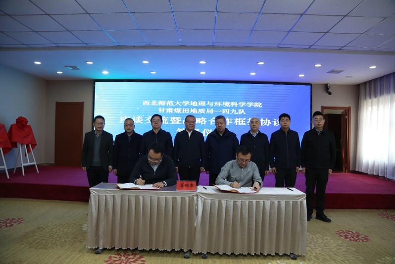 12月18日上午,437bwin必赢国际官网地环学院与甘肃煤田地质局一四九队举行战略合作框架协议签约仪式。甘肃煤田地质局党委委员、副局长时玉祥主持签约仪式,甘肃煤田地质局党委书记、局长张卫雄,地质信息处处长苗长生,一四九队党委书记、队长徐洋,党委副书记、纪委书记孙伟,党委委员、总工程师马代兵,党委委员、副队长师浩、李建锋,副总工程师、勘查院常务副院长尚兆聪,遥感与地理信息研究院院长甘君良,水工环地质研究院院长樊建纬,以及437bwin必赢国际官网副校长张明军,地环学院党委书记于国建,院长、党委副书记马利邦,党委副书记、副院长谢文涛,副院长姚晓军,资源与环境专业学位点负责人周喜斌等出席签约仪式。