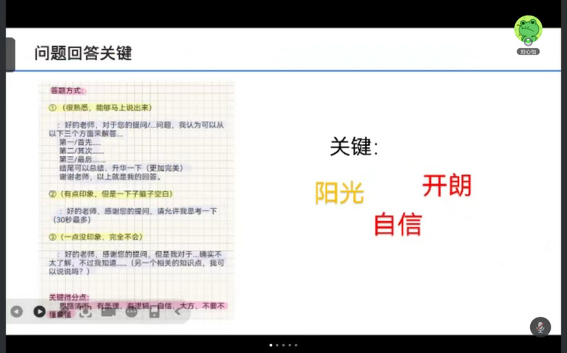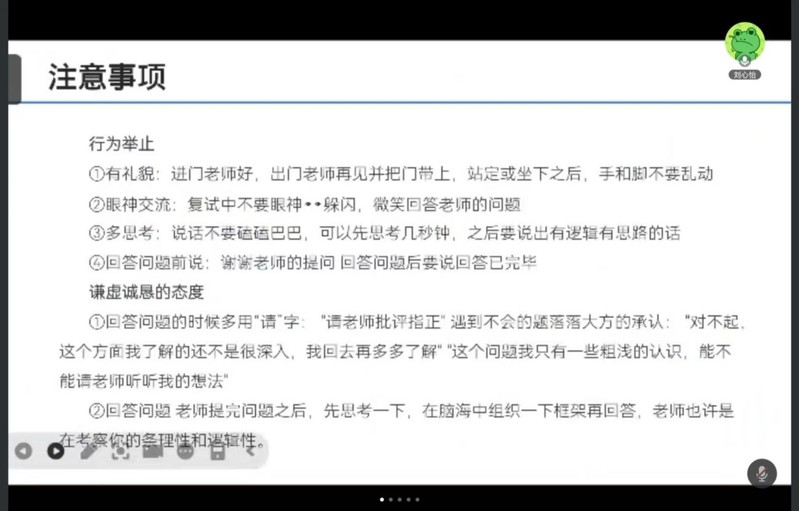 分享会上,几位同学从不同的层面和角度分享了自己考研面试的经验,围绕复试流程、备考策略、面试状态等关键问题进行阐述。吴静和刘心怡分享了复试时面对专业问题的应对方法以及如何巧妙展示自身实践经验与研究能力;刘紫雯和张晗箎提醒同学们在考试过程中保持诚恳的态度和得体的举止,建议同学们保持积极稳定的心态,自信从容应考;罗中和张钰婷建议同学们定期模拟面试积累实战经验,从而提升个人应试能力。