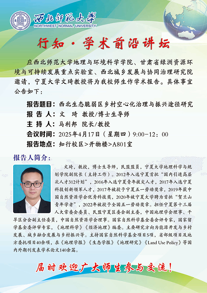 地环学院行知•学术前沿讲坛2025-04期:西北生态脆弱区乡村空心化治理与振兴途径研究