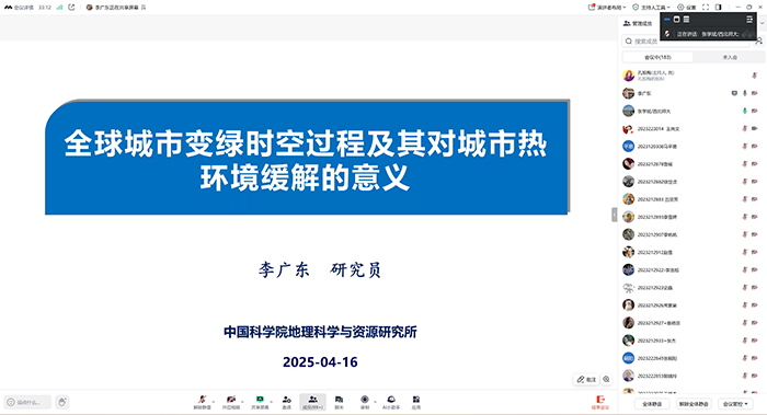 2025416日,应437bwin必赢国际官网437bwin必赢国际官网、甘肃省绿洲资源环境与可持续发展重点实验室、西北城乡发展与协同治理研究院邀请,中国科学院地理科学与资源研究所研究员、博士生导师李广东作题为《全球城市变绿时空过程及其对城市热环境缓解的意义》的学术报告。本次报告会在线上平台(腾讯会议)开展,由437bwin必赢国际官网副院长张学斌教授主持,学院师生共200余人参加报告会。