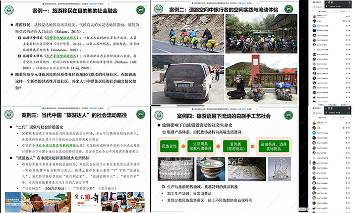 孙九霞教授首先结合几组数据的对比分析介绍了研究的相关背景。随后,在报告的第一部分中,她指出现代社会的新常态是全方位流动的,主要从流动的景观、流动的生活、流动的城市和旅游流动等方面进行了阐述。第二部分,孙九霞教授结合已有研究成果,分享了旅游移民在目的地的社会融合、道路空间中旅行者的空间实践与流动体验、当代中国“旅游达人”的社会流动路径、旅游语境下流动的白族手工艺社会等相关研究案例,引发了与会师生的浓厚兴趣。第三部分,孙九霞教授通过举例的方式,提出了关于学术研究的问题意识和理论创新的观点,鼓励大家形成真问题、创新真理论,进一步拓宽研究实践的领域。报告会后,孙九霞教授与师生在线展开了热烈的讨论,进行了广泛的交流。通过本次报告,大家对流动性背景下的学术研究等相关问题有了更加深入、全面的了解。