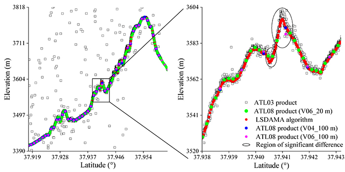 图3. 本文提出的算法与两套ATL08 产品 (V04 and V06)描述山区地表高程变化对比