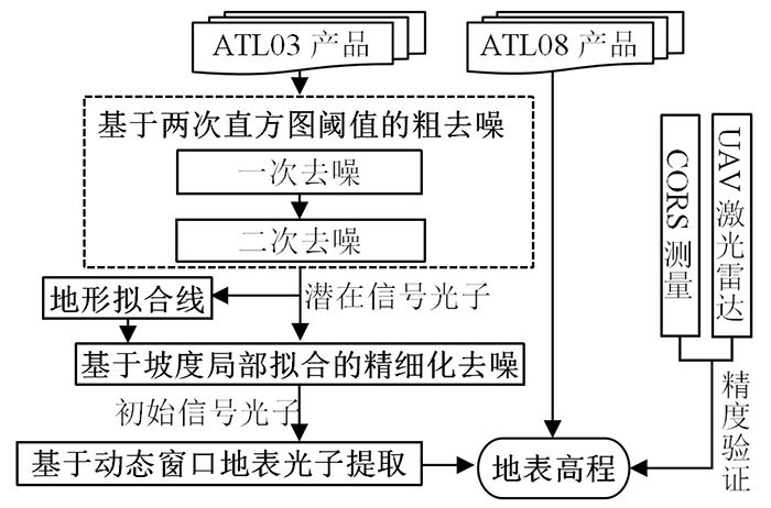 一般而言,激光点云提取包括粗去噪、精细化去噪和地表光子提取三个步骤。本文针对ATL08产品在山区点云密度及精度较低的问题,提出的基于局部统计山区点云提取方法对以上三个步骤均进行了改进: 基于两次直方图阈值的粗去噪、基于坡度局部拟合的精细化去噪和基于动态窗口的地表光子提取,其技术流程如图4所示。