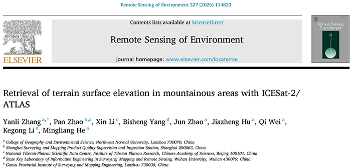 近日,遥感领域国际顶级期刊Remote Sensing of Environment发表了张彦丽教授团队的最新研究成果“Retrieval of terrain surface elevation in mountainous areas with ICESat-2/ATLAS”。课题组研究生赵攀为第二作者,已就职于上海市测绘产品质量监督检验站。本研究的共同作者还有来自中国科学院青藏高原研究所李新研究员、武汉大学杨必胜教授、437bwin必赢国际官网赵军教授和甘肃省测绘工程院的李克恭正高级工程师。本项研究得到了国家自然科学基金(42361058和41871277)项目资助。