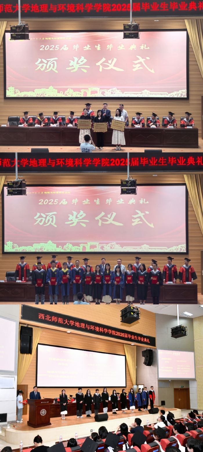 在庄严的国歌声中,地环学院2025届学生毕业典礼正式拉开帷幕。《我们毕业了》原创视频带领师生回顾了2025届毕业生在校期间的青春时光。学院党委书记于国建宣读了2025年地环学院“甘肃省优秀毕业生”、“超越奖学金”获得者、“考研优胜班集体”及“五四红旗团支部”的表彰决定,学院领导、学位委员会、学术委员会共同为获奖毕业生颁发荣誉证书。