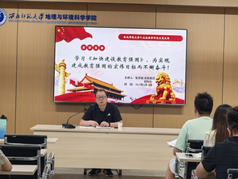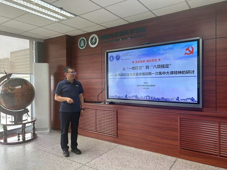 6月25日下午,党委书记于国建给地理科学系本科生第三党支部讲党课,与学生共同学习中央八项规定精神,6月26日上午,于国建给院办教职工党支部作了题为《八项规定改变中国》的专题党课;6月27日,院长、党委副书记马利邦为城市与资源学系教工党支部作了《从“一根灯芯”到“八项规定”——关于2025年党员基本培训第一次集中大课精神的研讨》的党课;2025年6月26日,党委副书记谢文涛为本科生第二党支部作了题为《筑牢中华民族共同体意识专题学习》的党课;副院长姚晓军、张学斌、胡梦珺等也分别于近期为地理信息学系教工党支部、人文地理学研究生党支部及地理科学系教工党支部讲了党课。