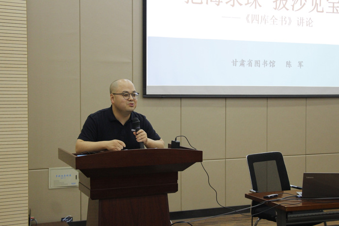 活动以“千古巨制——《四库全书》”宣传短片启幕,随后,甘肃省图书馆副馆长陈军作《四库全书》专题讲座,从《四库全书》的缘起、编纂、七阁《四库全书》的存藏与流转到文溯阁《四库全书》以及创意四库,层层解析《四库全书》这部中国古代规模最大的丛书。
