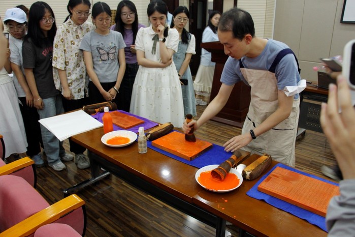 讲座结束后在非遗体验区实物展出了文溯阁《四库全书》影印本——原大原样影印精选文溯阁本《四库全书》四种。现场设置雕版印刷操作台,学生们可亲手完成刷墨、铺纸、拓印等传统工序,在油墨氤氲间触摸典籍制作的匠心,沉浸式感受中华文脉的源远流长。