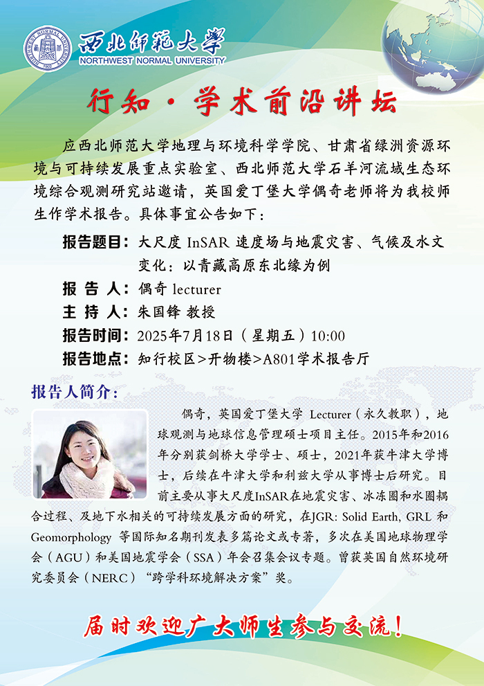地环学院行知•学术前沿讲坛2025-15期:大尺度 InSAR 速度场与地震灾害、气候及水文变化:以青藏高原东北缘为例