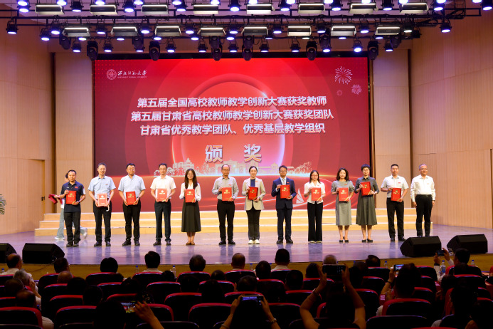副校长张明军为第五届全国高校教师教学创新大赛新文科正高组一等奖获得者,第五届甘肃省高校教师教学创新大赛获奖团队、甘肃省优秀教学团队、优秀基层教学组织获奖代表颁奖